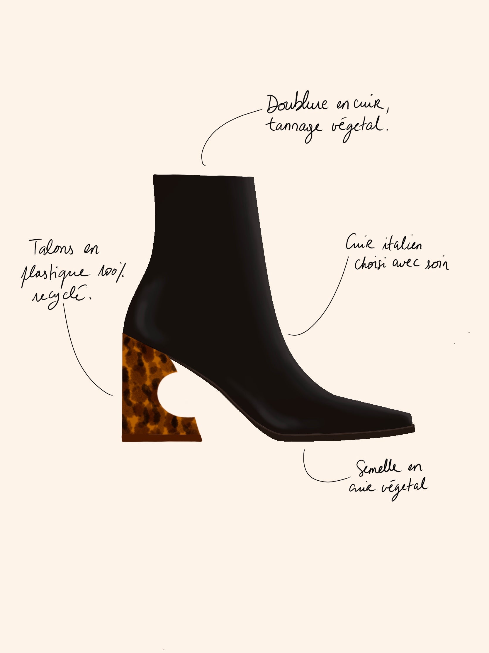 Grâce à notre système breveté, vous pouvez changer vos talons en quelques secondes, sans outil. Il vous suffit de clipser le talon de votre choix à l’arrière de votre bottine, le mécanisme est discret, sécurisé et facile à utiliser.