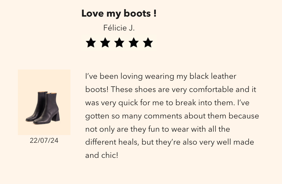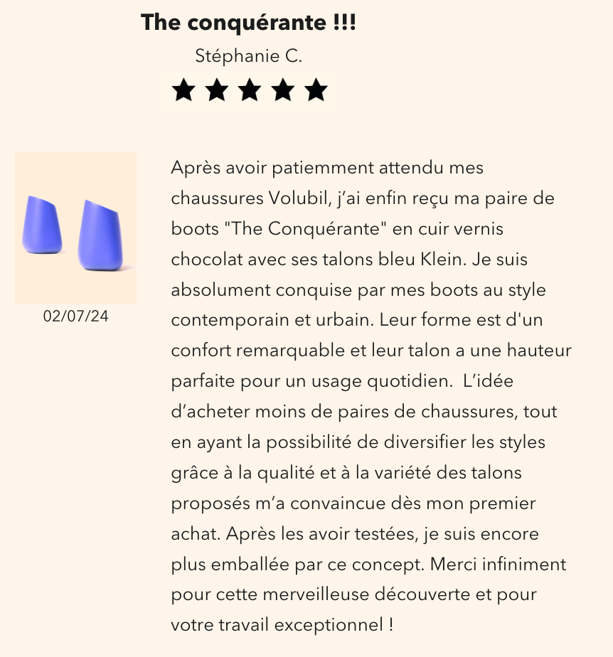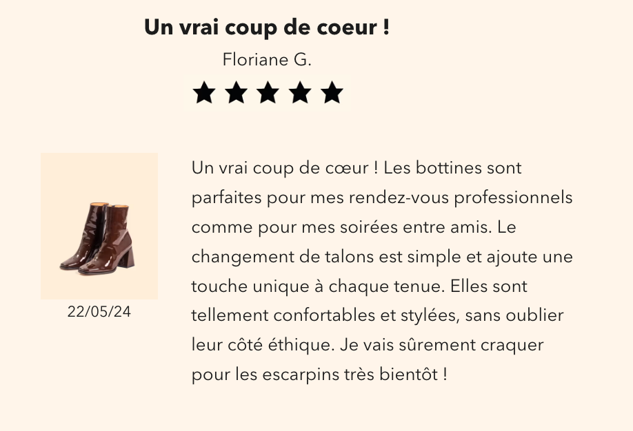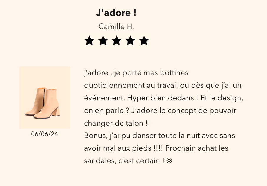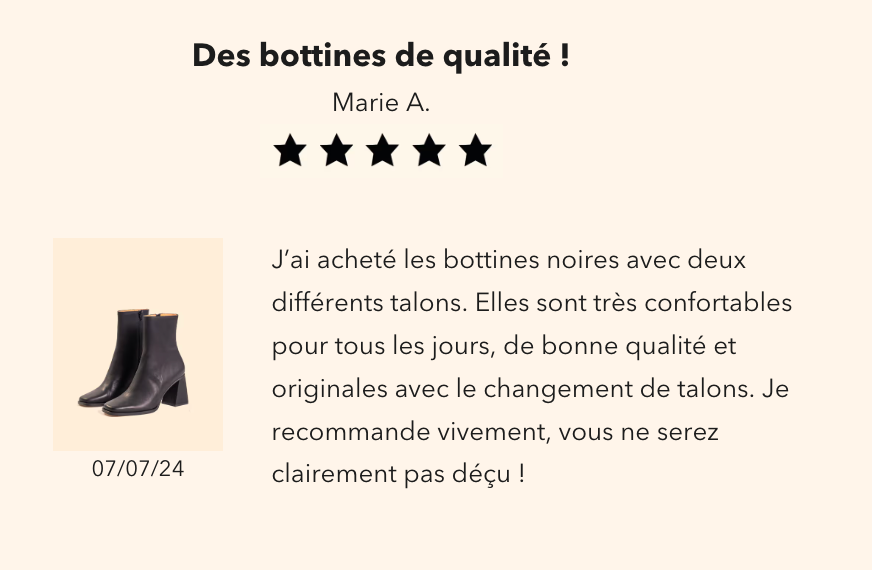 Nos souliers ont été imaginés et développés avec amour, alors nous espérons qu'ils vous iront comme un gant ! Mais si jamais ce n'était pas le cas vous avez 15 jours après la date de livraison pour échanger ou faire un retour gratuitement.